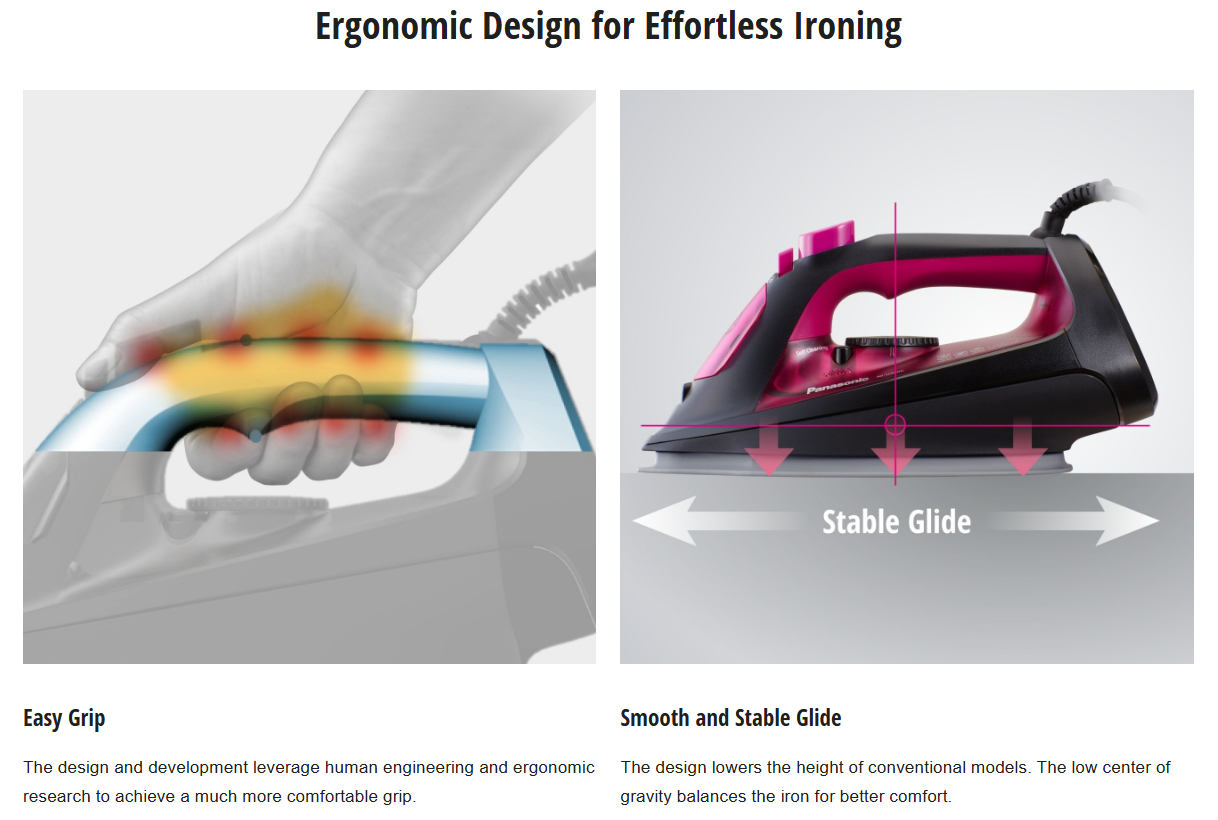 The design lowers the height of conventional models. The low center of gravity balances the iron for better comfort.
