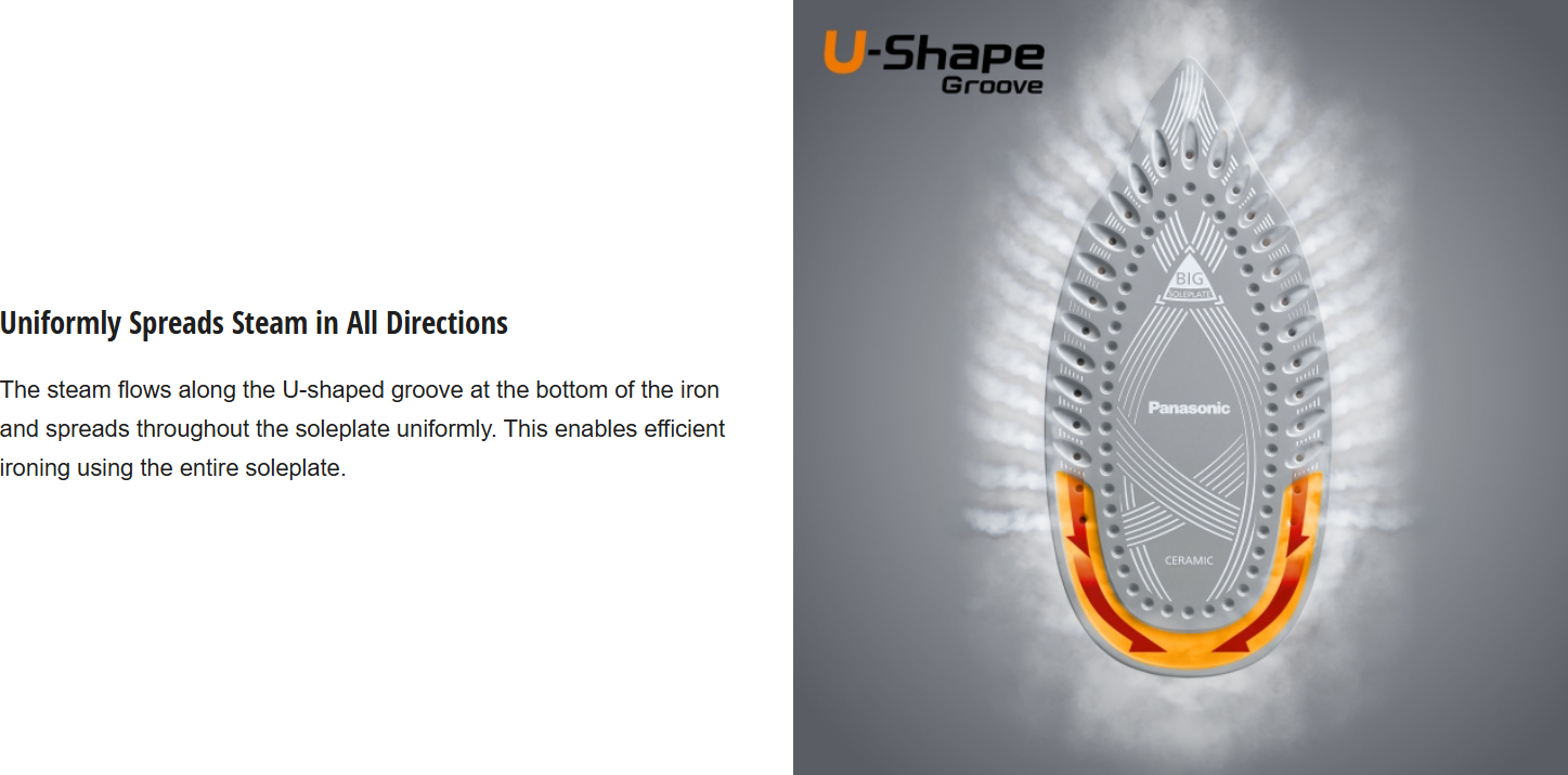 The steam flows along the U-shaped groove at the bottom of the iron and spreads throughout the soleplate uniformly. This enables efficient ironing using the entire soleplate.