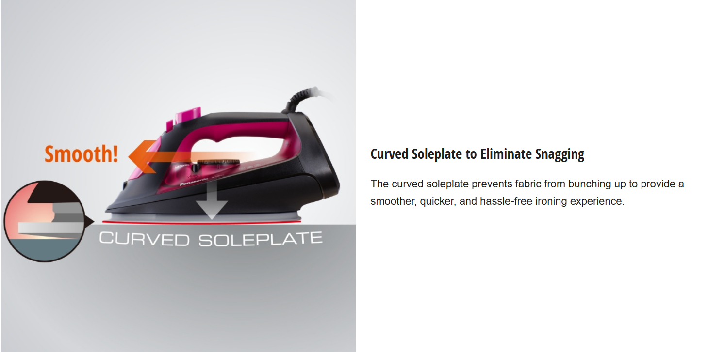 The curved soleplate prevents fabric from bunching up to provide a smoother, quicker, and hassle-free ironing experience.