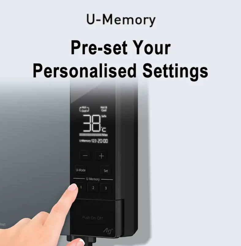 Set personalised profiles with U-Memory for you and your family. Quickly switches between profiles of preferred water temperature and water texture with just a touch of a button. Perfect for families who share a shower at home.