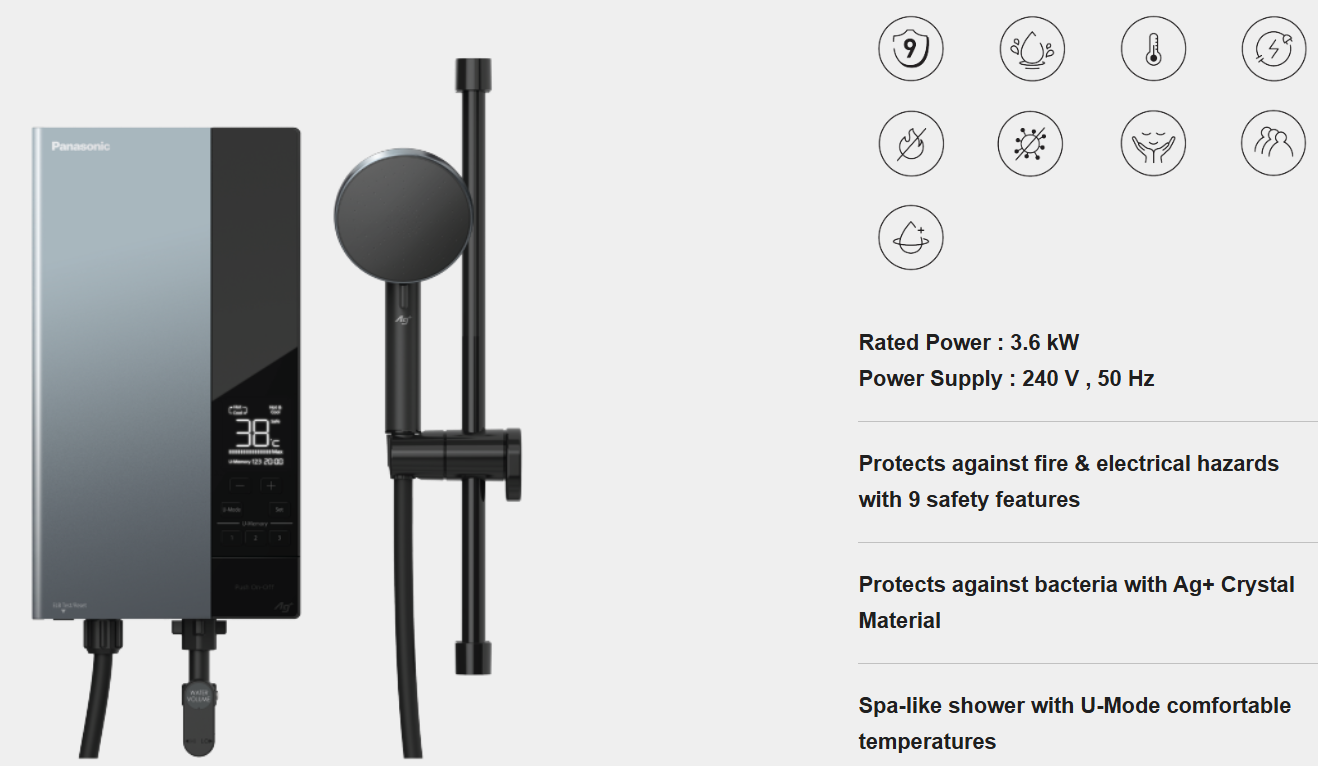 Leave your worries out of the bathroom. Panasonic U Series is built with 9 safety features that help to prevent electric shocks, fire & burn. The shower panel is water-splash proof to protect the internal components, while the Ag+ Crystal Material prevents the growth of bacteria for a more carefree shower experience.