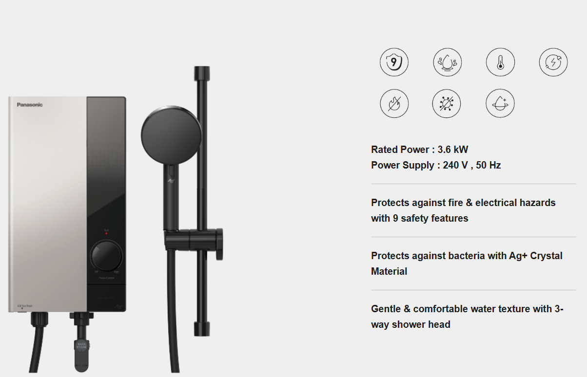 Leave your worries out of the bathroom. Panasonic U Series is built with 9 safety features that help to prevent electric shocks, fire & burn. The shower panel is water-splash proof to protect the internal components, while the Ag+ Crystal Material prevents the growth of bacteria for a more carefree shower experience.