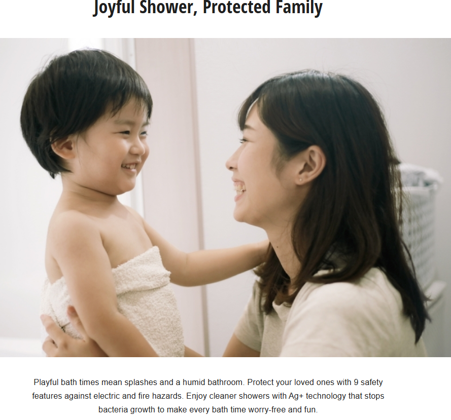 Playful bath times mean splashes and a humid bathroom. Protect your loved ones with 9 safety features against electric and fire hazards. Enjoy cleaner showers with Ag+ technology that stops bacteria growth to make every bath time worry-free and fun.