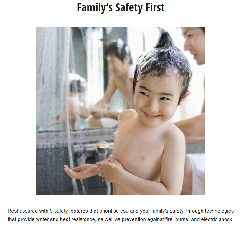 Rest assured with 9 safety features that prioritise you and your family's safety, through technologies that provide water and heat resistance, as well as prevention against fire, burns, and electric shock.