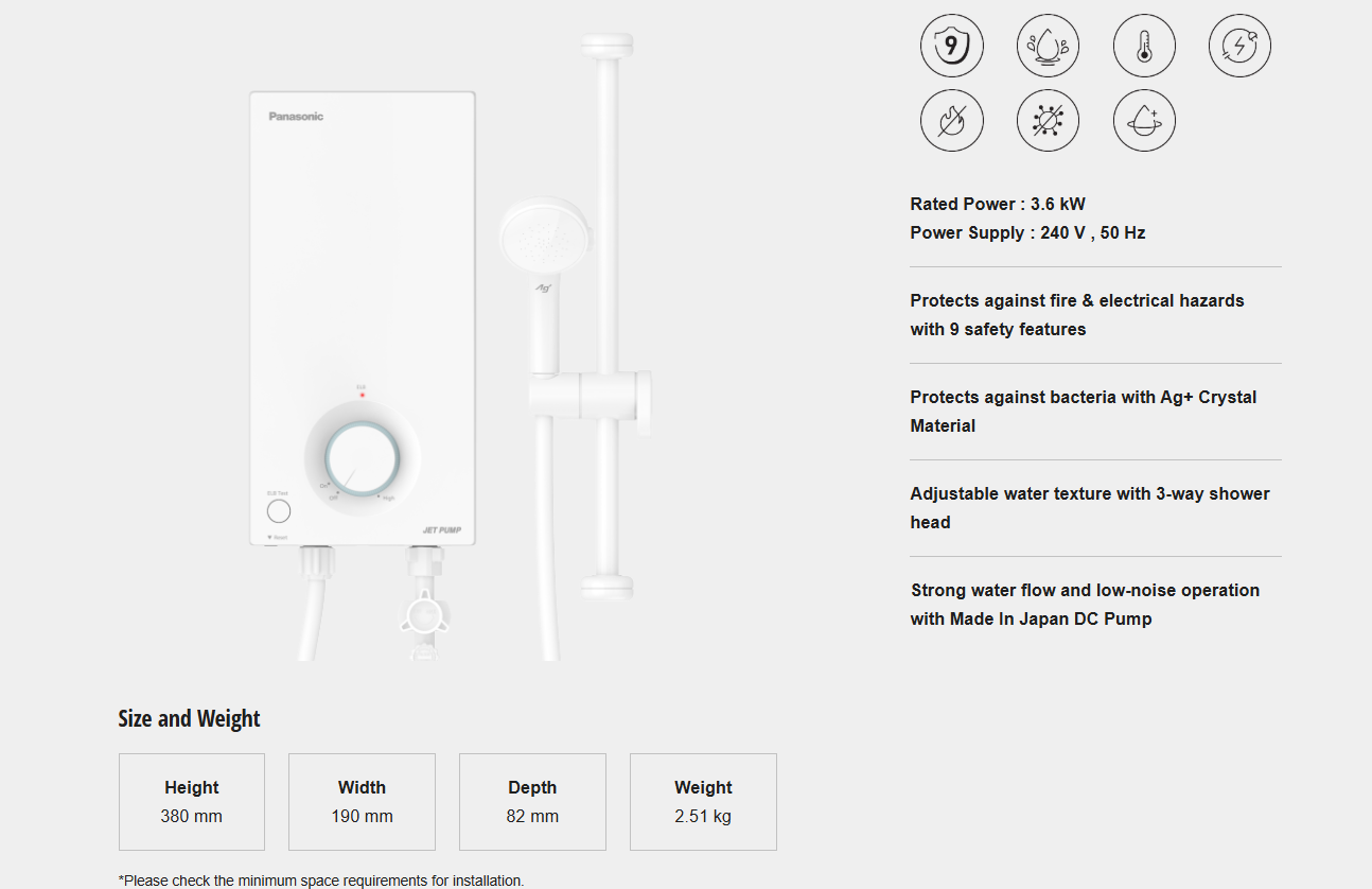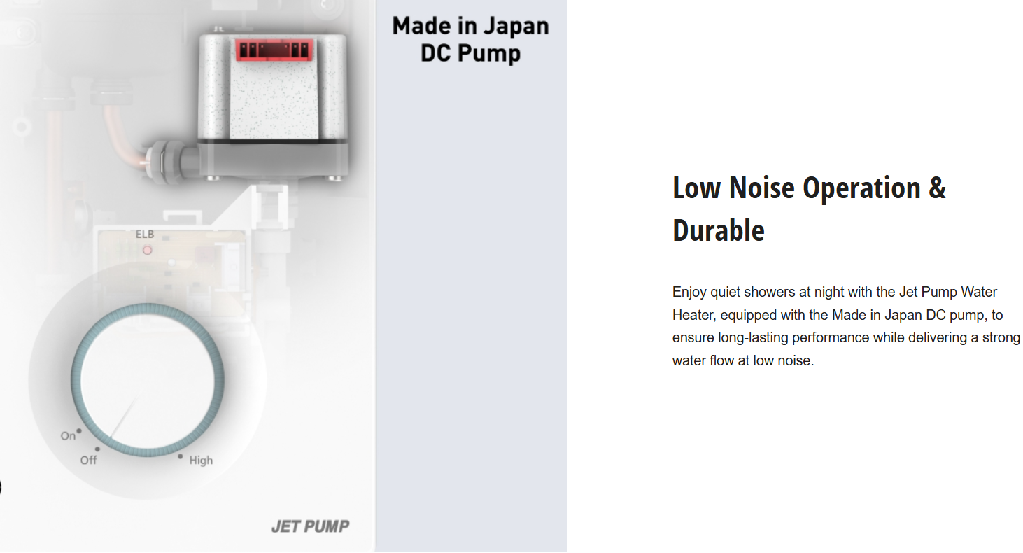 Enjoy quiet showers at night with the Jet Pump Water Heater, equipped with the Made in Japan DC pump, to ensure long-lasting performance while delivering a strong water flow at low noise.