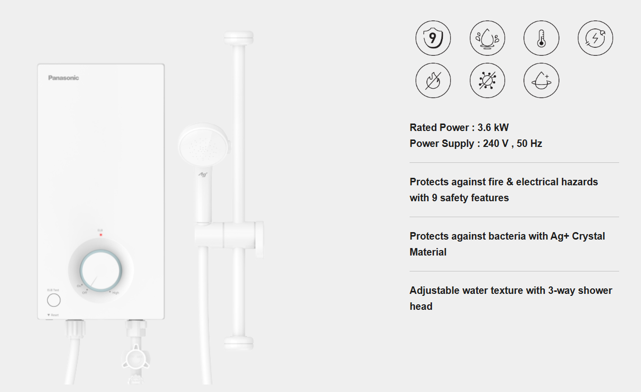 Playful bath times mean splashes and a humid bathroom. Protect your loved ones with 9 safety features against electric and fire hazards. Enjoy cleaner showers with Ag+ technology that stops bacteria growth to make every bath time worry-free and fun.
