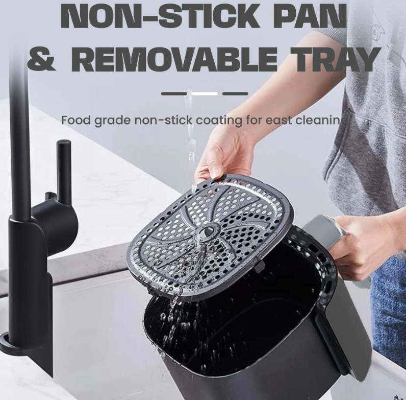 - Simply wipe down the exterior with a damp cloth after cooking. The removable non-stick basket tray, made with food-grade material, is dishwasher safe and free of PFOA and BPA.