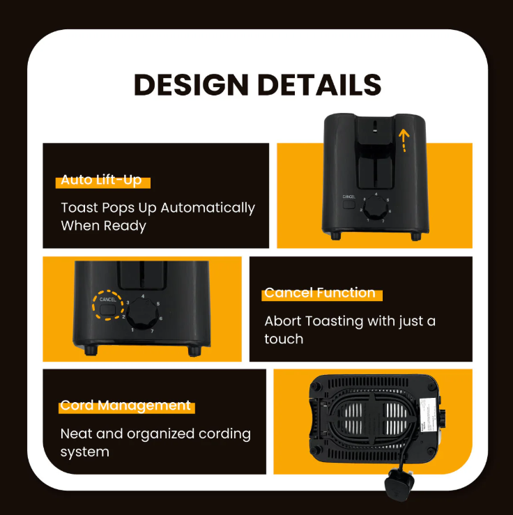 - With easy-to-use push-down toasting lever and non-slip feet. The crumb tray has a simple wipe-away surface for quick cleaning.