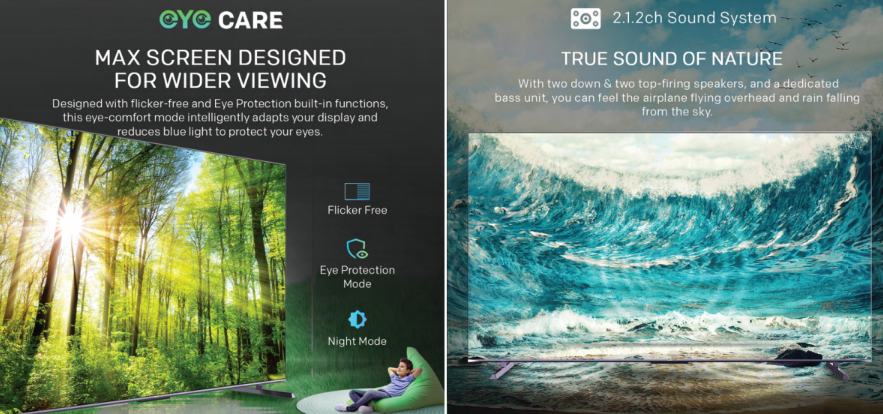 HDMI PORTS | 3 (2.1*2/2.0*1) | SOUND EFFECT | AUDIO DRUM (SUBWOOFER) +2.1.2CH SOUND SYSTEM | FILMMAKER MODE | ||||