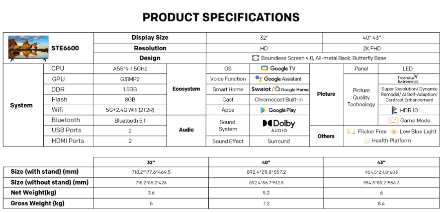 System | CPU | A55'4-1.5GHz | Ecosystem | OS | Google TV | Picture | Panel | LED |